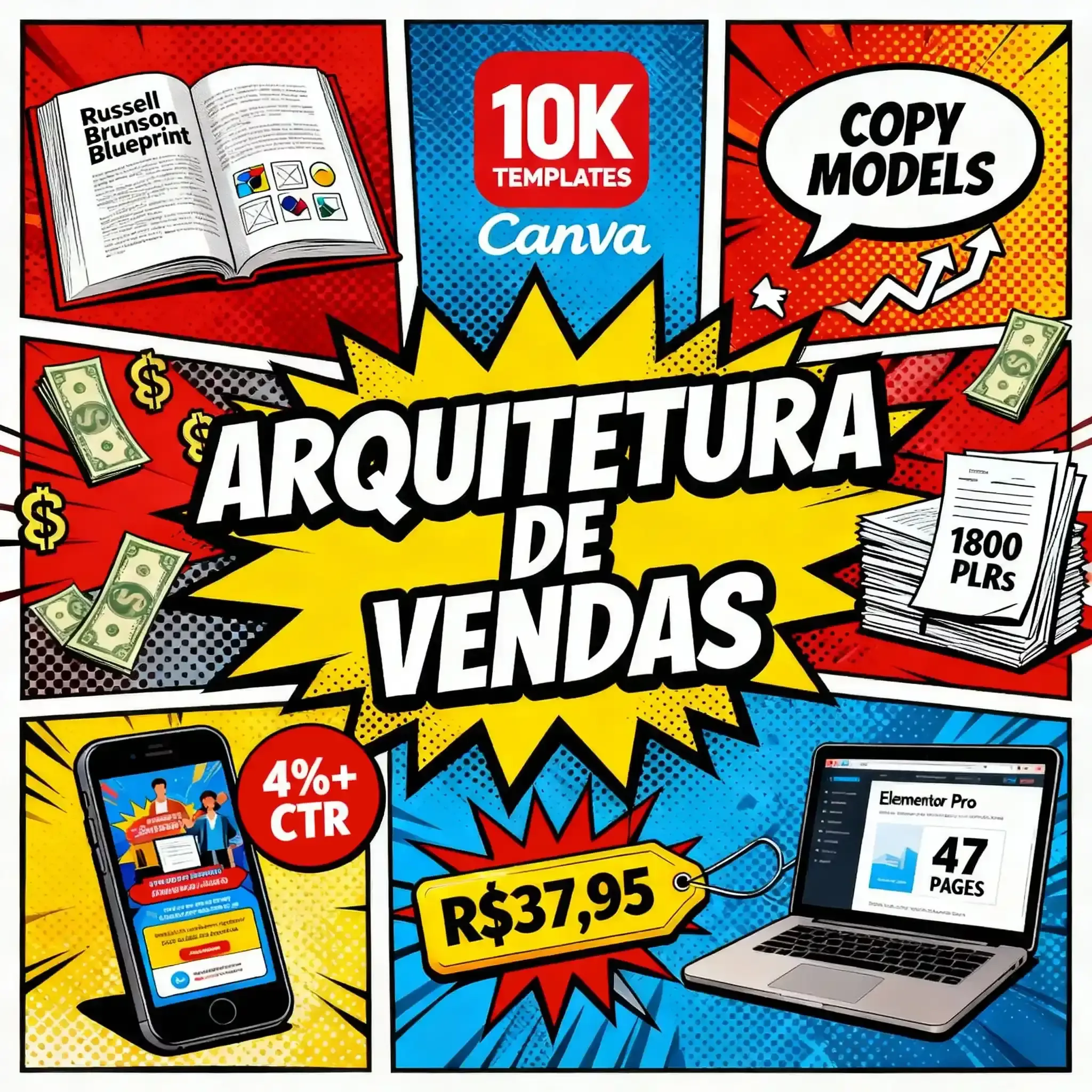 É um pacote completo com 6 bônus digitais para transformar suas vendas online: Blueprint de Russell Brunson, 10 mil Artes Canva, Modelos de Copy Validados, 1.800 PLRs, Criativos Vetorizados com 4%+ de CTR e 47 Páginas Elementor Pro pré-configuradas.